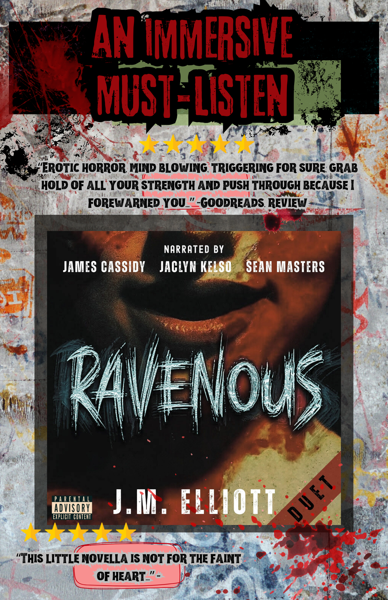 RAVENOUS is an erotic horror with psychological thriller elements. It is not a love story; you will find no romance nor a happy ever after. In-between the pages you will find more triggers than there are fish in the sea. PLEASE CHECK THE WARNINGS. THIS AUDIOBOOK IS NOT A BLIND-LISTEN. YOUR MENTAL HEALTH MATTERS.